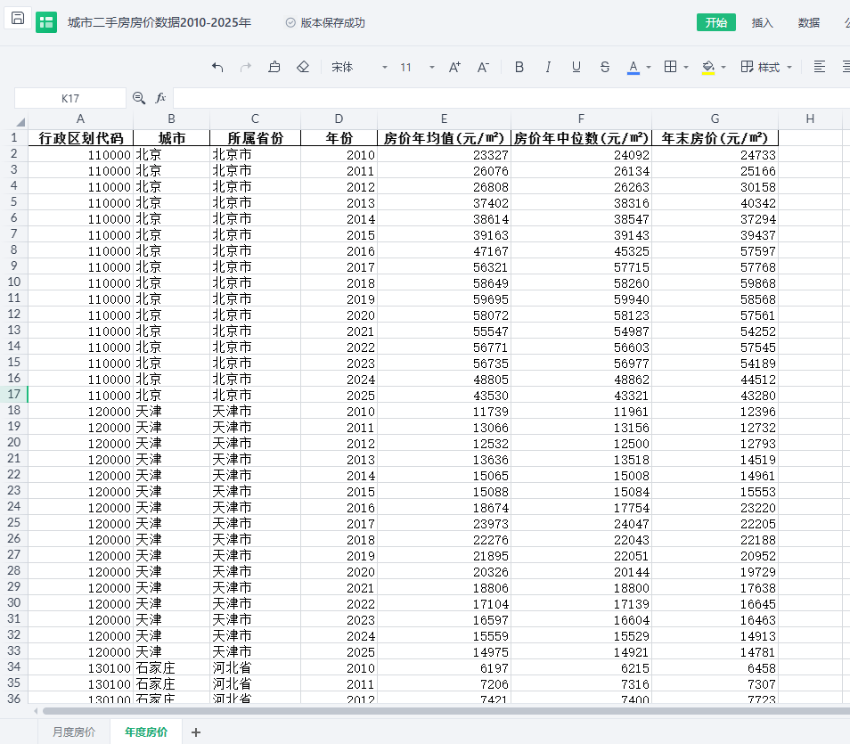 :行政区划代码 城市 所属省份 年份 月份 二手房均价(元/㎡) 房价年均值(元/㎡) 房价年中位数(元/㎡) 年末房价(元/㎡)