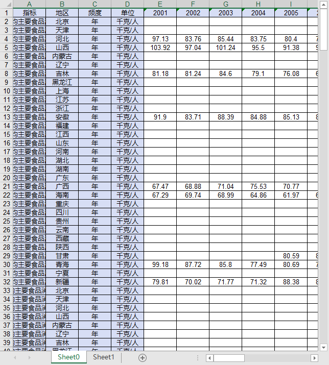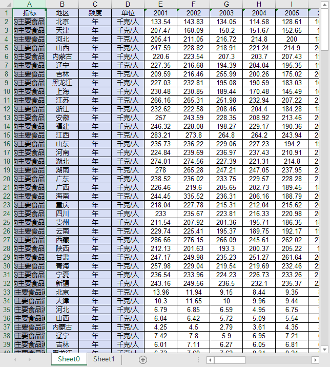 全国31个省份农村城镇居民主要食品消费量2001-2024粮食食用油蔬菜菌肉禽蛋奶干鲜瓜果类水产品食糖