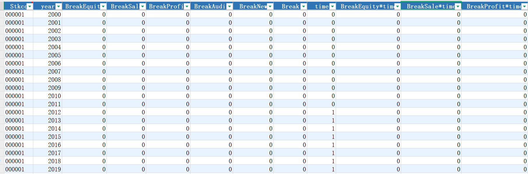 Break 触及任意退市规定指标,1表示触及任意一条退市规定(包括新增规定和连续两年亏损),0表示未触及