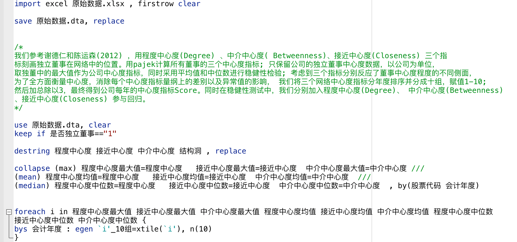 我们参考谢德仁和陈运森(2012) ,用程度中心度(Degree) 、中介中心度( Betweenness)、接近中心度(Closeness) 三个指 标刻画独立董事在网络中的位置。用pajek计算所有董事的三个中心度指标; 只保留公司的独立董事中心度数据,以公司为单位,取独董中的最大值作为公司中心度指标,同时采用平均值和中位数进行稳健性检验; 考虑到三个指标分别反应了董事中心度程度的不同侧面,为了全方面衡量中心度,消除每个中