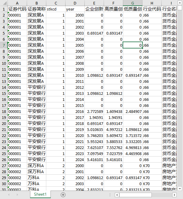 证券代码 证券简称 stkcd year 企业创新 高质量创新 低质量创新 行业代码 行业名称 所属省份 所属省份代码 所属城市 所属城市代码