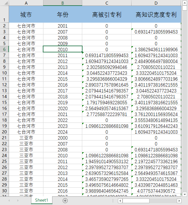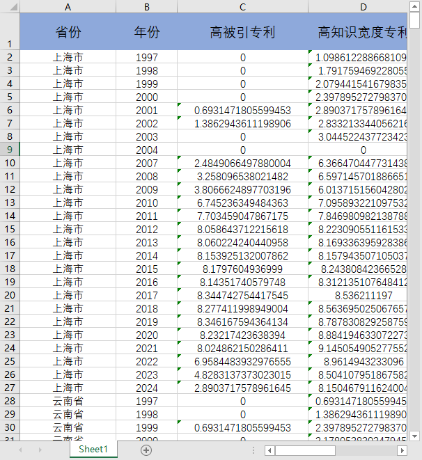 后三个指标均能用做衡量高质量创新,具体选用哪个根据同学自身需求以及参考文献来。注意,没有省份代码和城市代码,想做匹配的同学需要自行添加处理,介意勿拍。