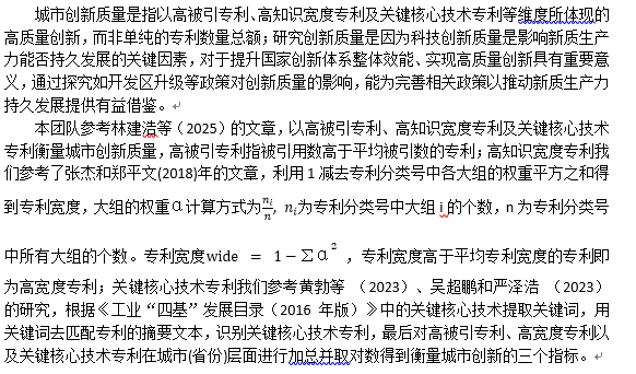 本团队参考林建浩等(2025)的文章,以高被引专利、高知识宽度专利及关键核心技术专利衡量城市创新质量,高被引专利指被引用数高于平均被引数的专利;高知识宽度专利我们参考了张杰和郑平文(2018)年的文章,利用1减去专利分类号中各大组的权重平方之和得到专利宽度,大组的权重