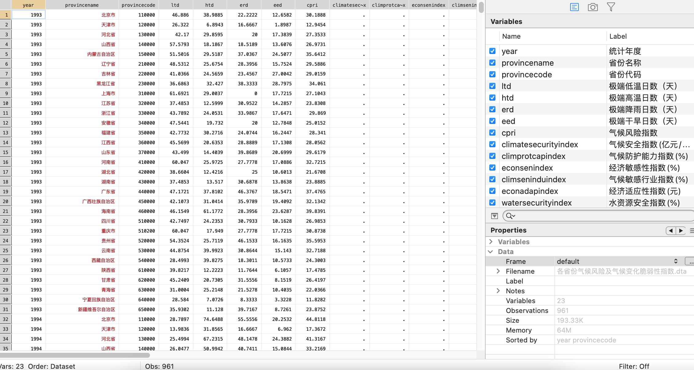 数据说明:各省份气候风险及气候变化脆弱性指数整理了全国31个省、市的极端低温日数(天)、极端高温日数(天)、极端降雨日数(天)、极端干旱日数(天)、气候风险指数、气候安全指数(亿元/公顷)、气候防护能力指数(%)、经济敏感性指数(%)、气候敏感行业指数(%)、经济适应性指数(元)、水资源安全指数(%)、自然资源禀赋指数(%)、人口脆弱性指数(%)、灾害敏感性指数(%)、生计脆弱性指数(%)、人口教育指数(%)、人口健康指数(岁)、公共卫生适应能力指数(人)、社会公平指数(%)、环境风险治理能力指数(次/元),数据提供.xlsx和.dta两种格式。