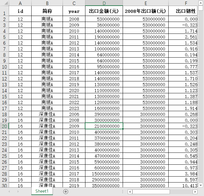 代码 简称 年份 出口金额(元) 08出口 出口韧性 出口韧性(缩尾后)