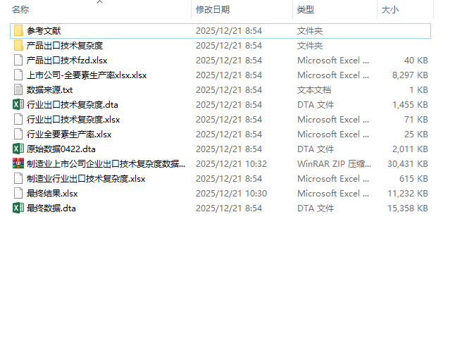 数据整理行业进出口复杂度,产品出口复杂度,上市公司全要素生产率,行业全要素生产率等。数据包括原始数据和最终结果。