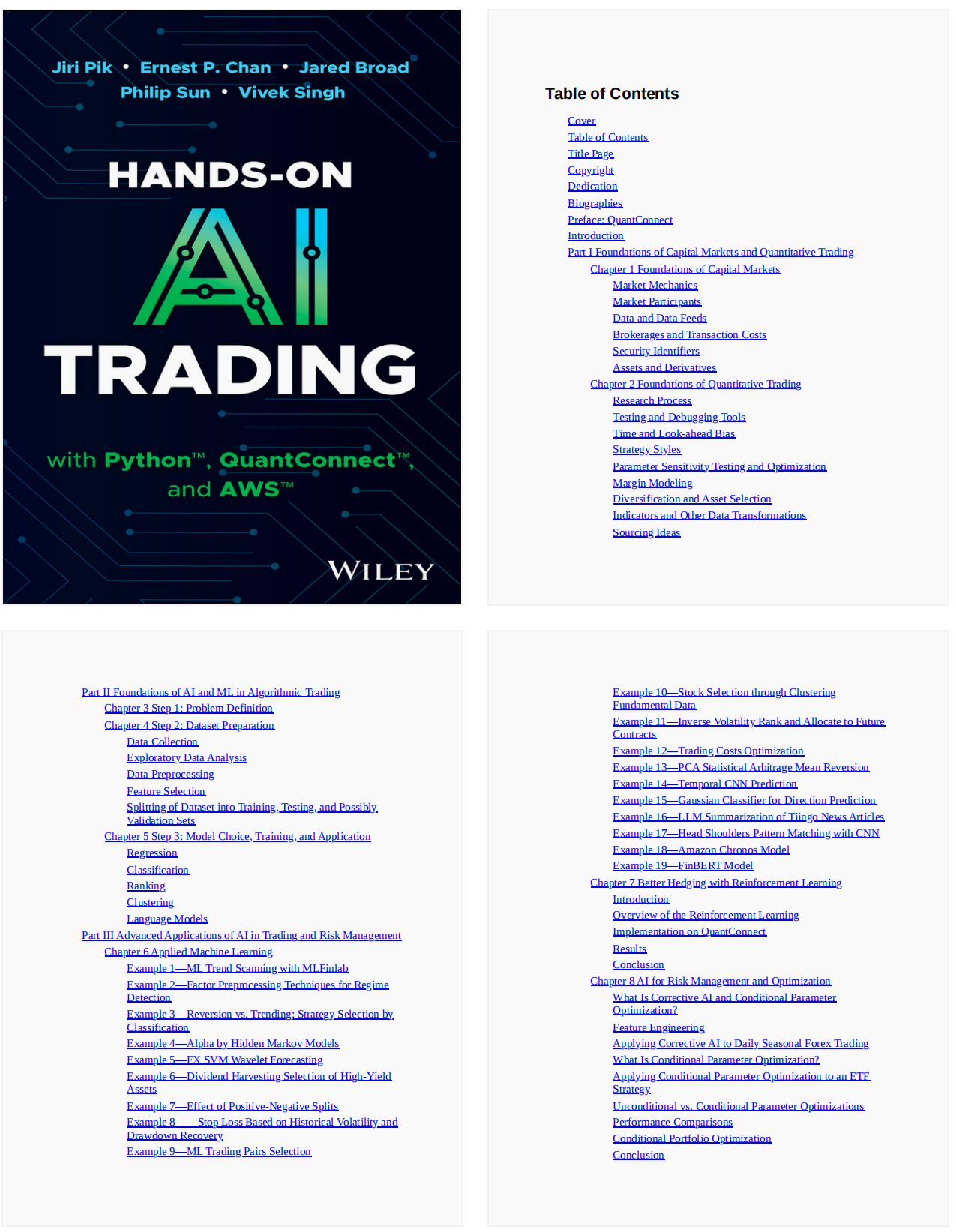 The book starts with an overview of financial trading and QuantConnect's platform, organized by AI technology used:
