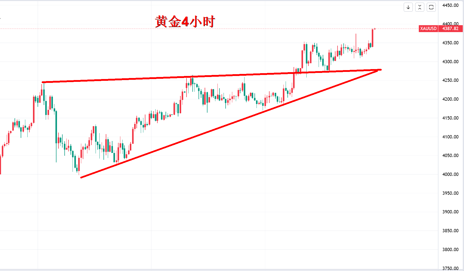 目前,4小时整体行情已经突破4380前高点,亚盘加速向上挑战新高,前期整理后区间不断压缩,现在要关注欧盘的延续性,也就是说突破后亚盘上涨,欧盘只要守在亚盘起涨点上方,美盘前依旧有多的机会。今天,黄金稍后回调在4365-75美元的范围内多,多空的重点在于4330美元,这里是决定突破后延续的关键位置,向上关注4390-4400美元,尤其4400美元整数关口,由于现在行情基数大,方向给了但具体位置临盘内部再出。