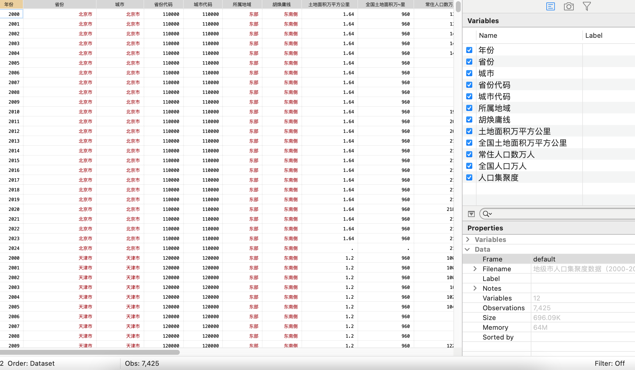 数据指标:年份 省份 城市 省份代码 城市代码 所属地域 胡焕庸线 土地面积 全国土地面积 常住人口数 全国人口 人口集聚度