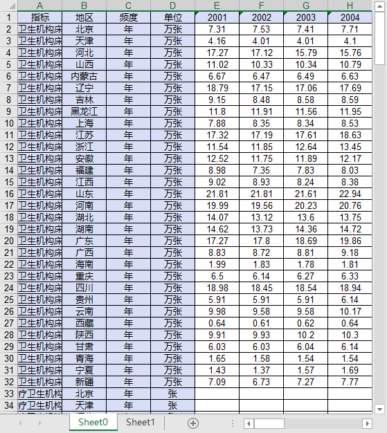 全国31个省份2001-2024医院和卫生院每万人城市农村医疗卫生机构床位数农业人口乡镇卫生院床位数