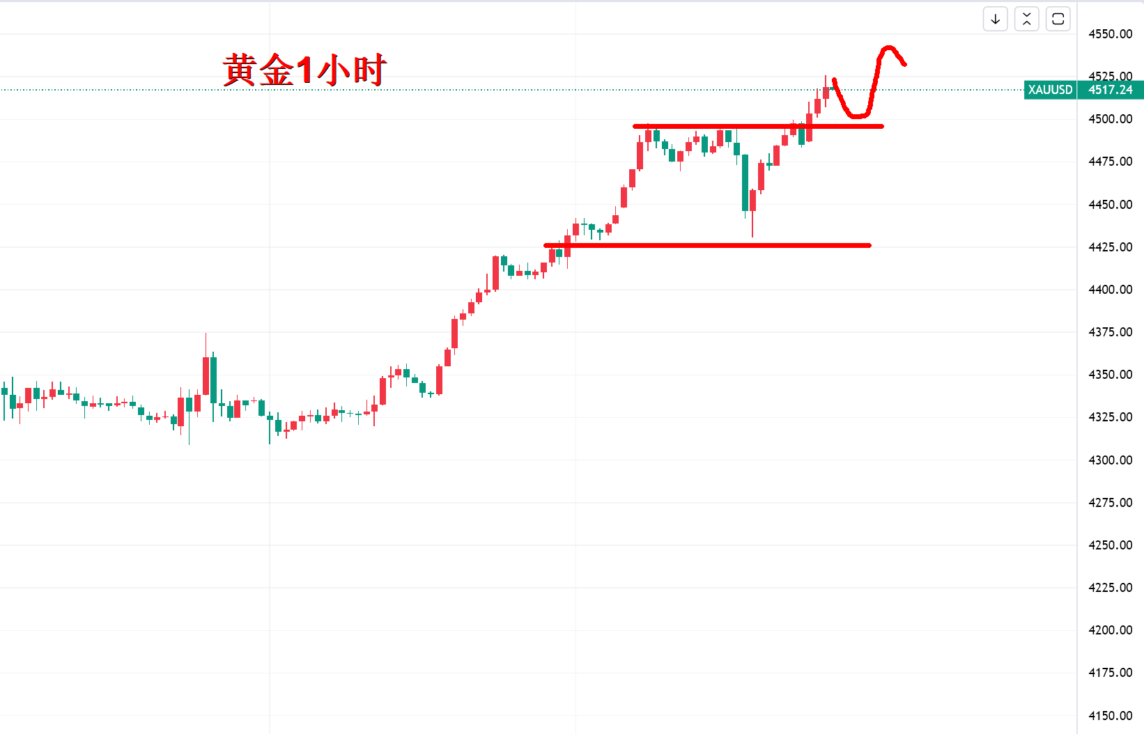 黄金多次上演“一脚油门一脚刹车”,尤其美盘后半夜空杀多异常激烈,金价成功站上4500美元历史性高点,上升过程伴随反复洗盘,昨晚后半夜4500美元快速跌到4430美元,这种快速的回抽高位追多有可能被一车带走。