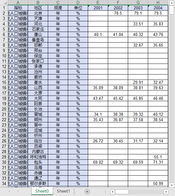 每个指标一个数据文件,每个数据文件包含近300个地级市城市(部分数据指标另外有省级汇总统计):