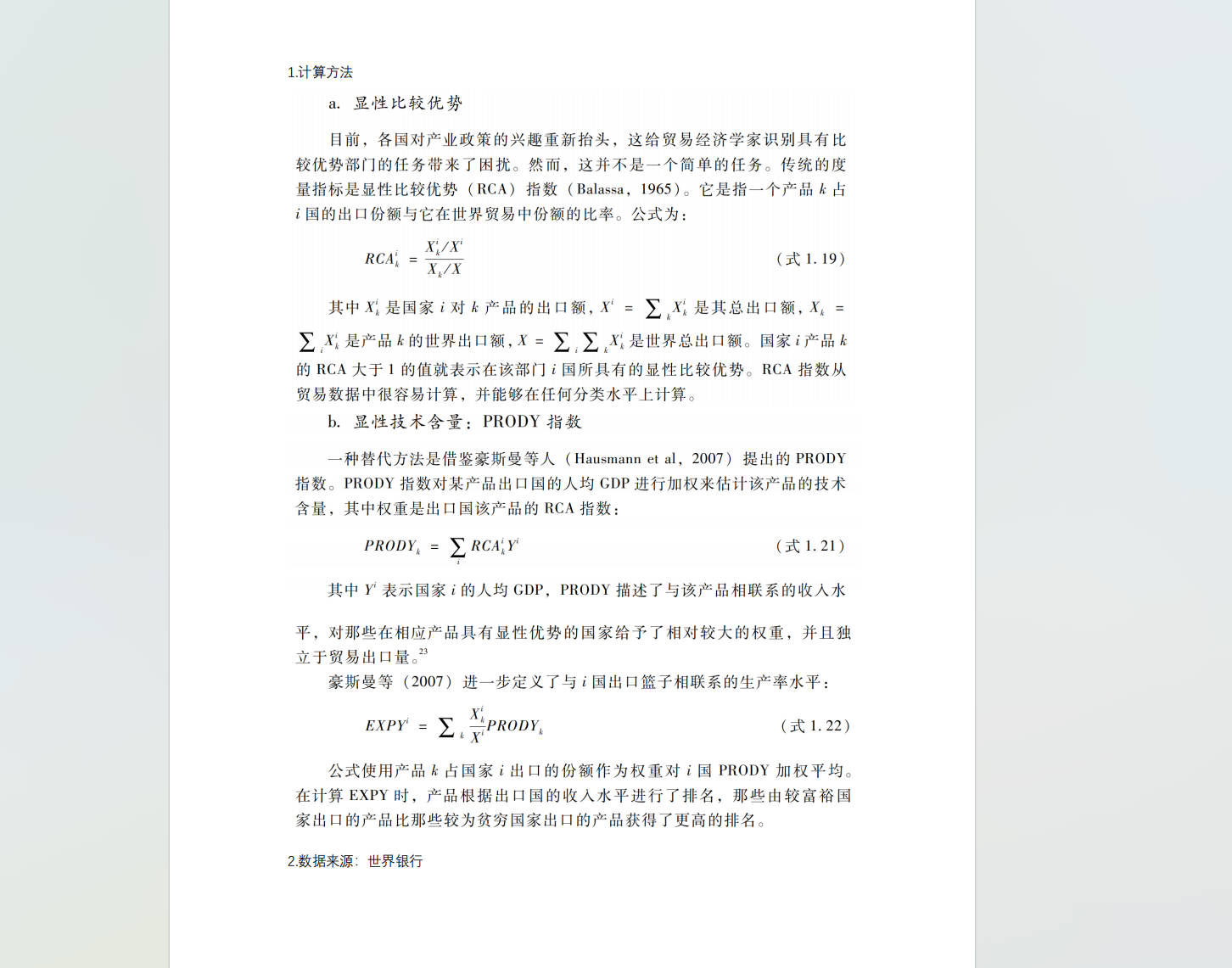 RCA指数大于1表示该国在该产品上具有显性比较优势。RCA指数可从贸易数据中直接计算,并能够在任何分类水平上计算。