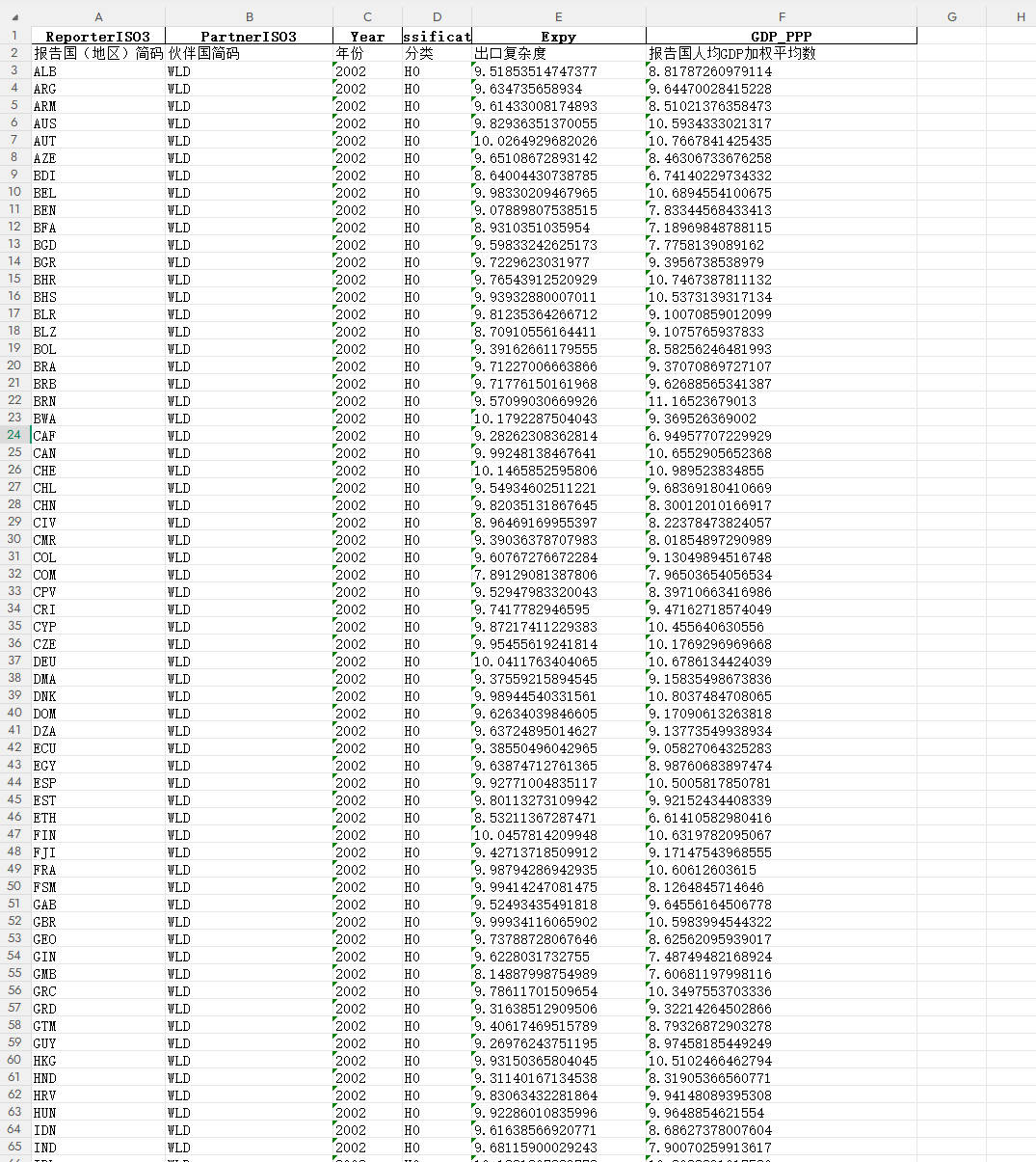 本数据覆盖150多个国家和地区,时间跨度为2002-2022年,共计3207条观测值,为研究全球贸易格局演变、产业结构升级和国际竞争力比较提供了丰富的数据支撑。