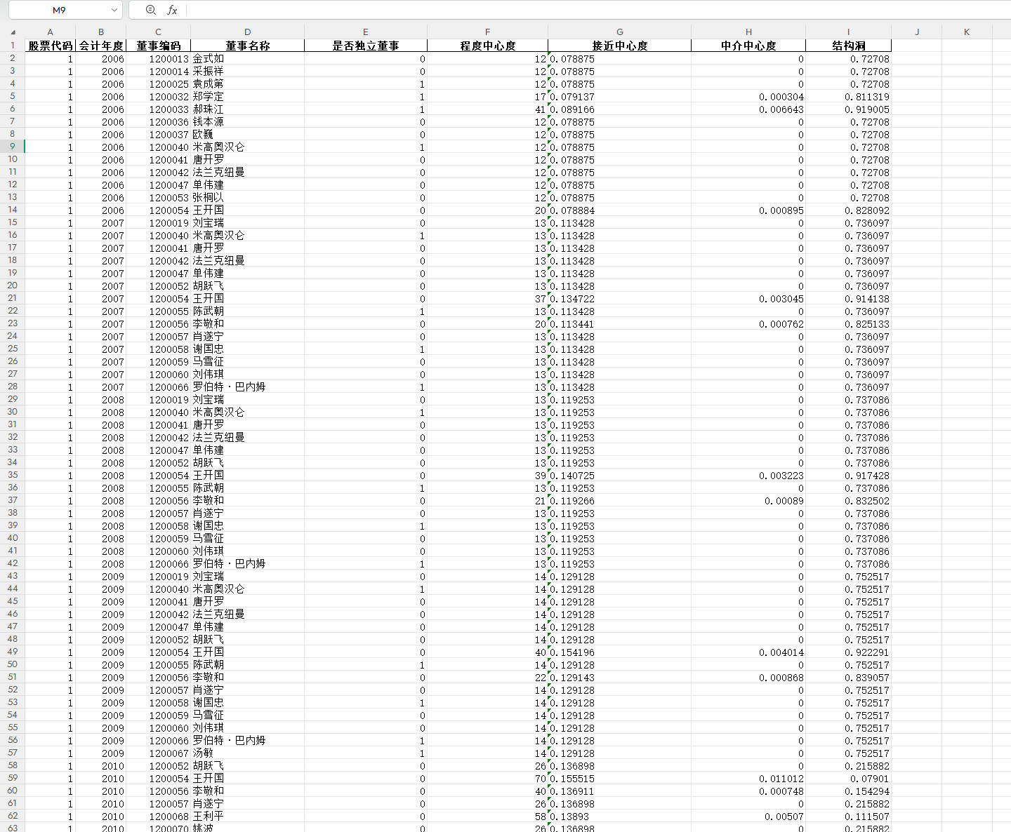 - 该值越大,表示董事i在网络中占据的结构洞数量越多,越具有董事网络优势