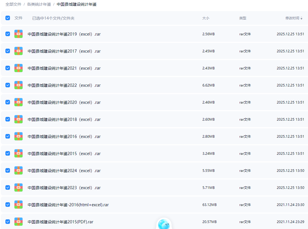 中国县城建设统计年鉴2015-2024县城市政公用设施水平人口与建设用地财政资金收支等12类专项数据