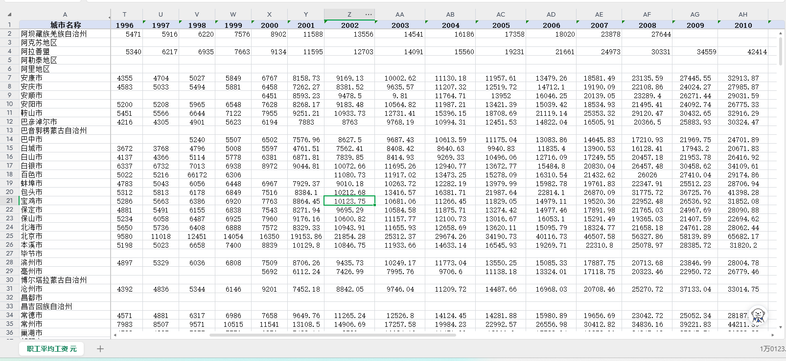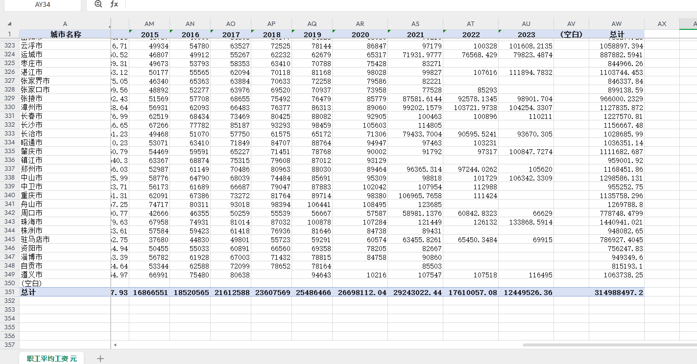 城市、年度、平均工资