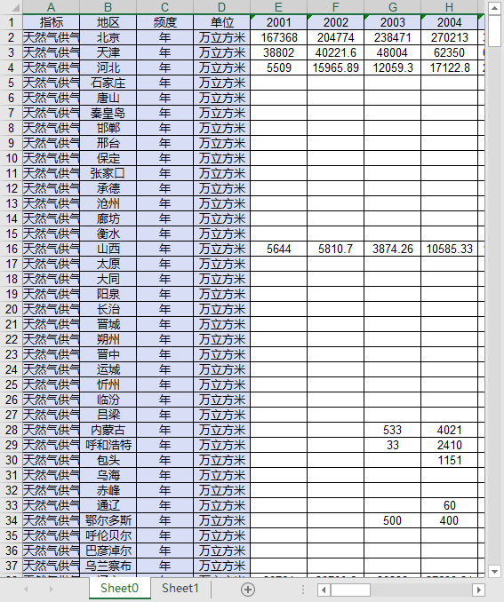 全国各地级市城市2001-2024城市天然气供气总量居民家庭