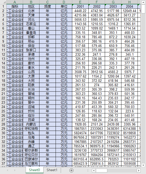 每个指标一个数据文件,每个数据文件包含近300个地级市城市(部分数据指标另外有省级汇总统计):