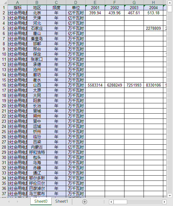 每个指标一个数据文件,每个数据文件包含近300个地级市城市(部分数据指标另外有省级汇总统计):
