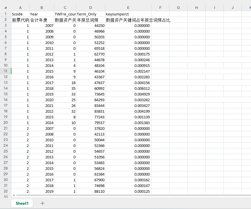 股票代码;年份;上市公司各会计年度关键词词频统计总数;年报文本总词语数,不包括停用词,停用词是指英文单词、标点符号和无意义中文单词(例如:哎呀,不仅,而且)等;上市公司各会计年度数据资产关键词占年报总词频百分比;