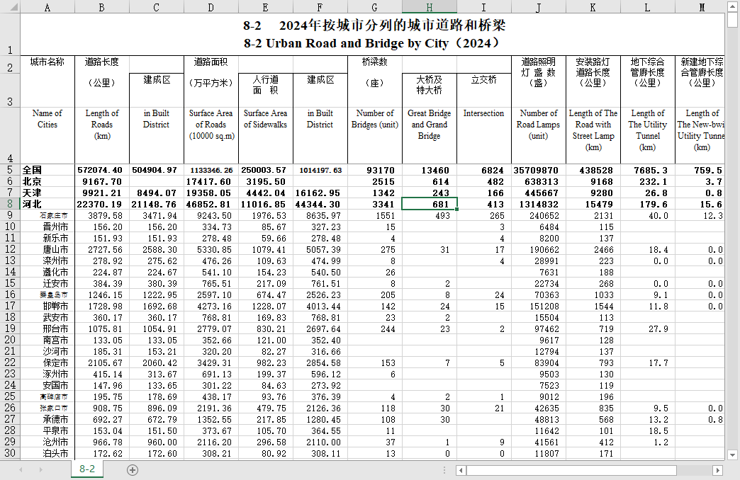 地级市县级市城市道路和桥梁建成区道路长度人行道面积道路照明路灯盏数地下综合管廊2006-2024