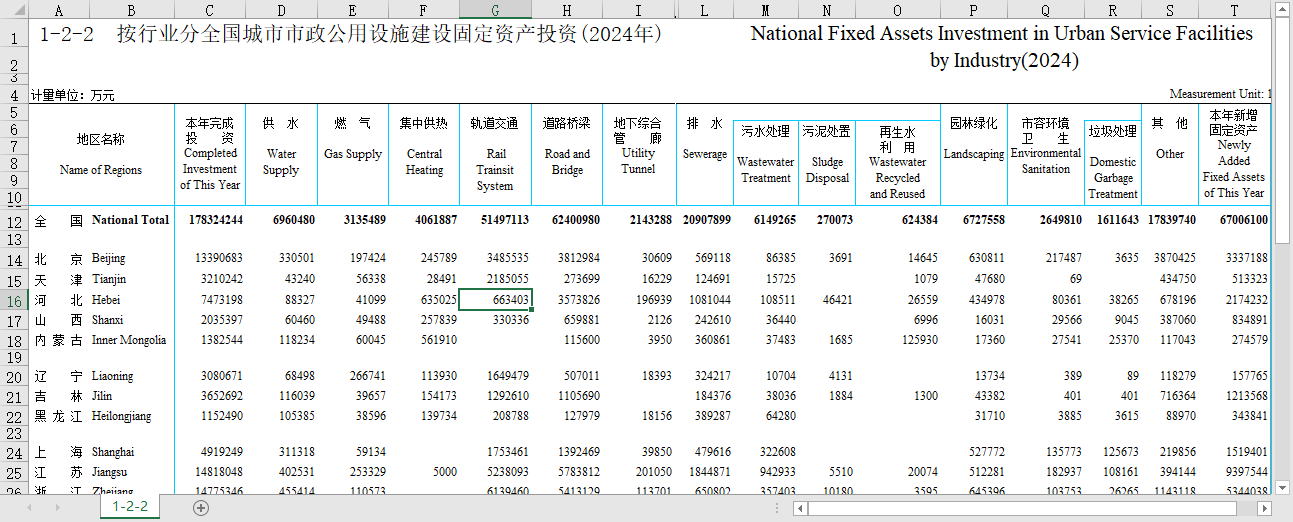 1-4-2 全国32个省份按行业分全国分省城市市政公用设施建设固定资产投资(2006-2024)