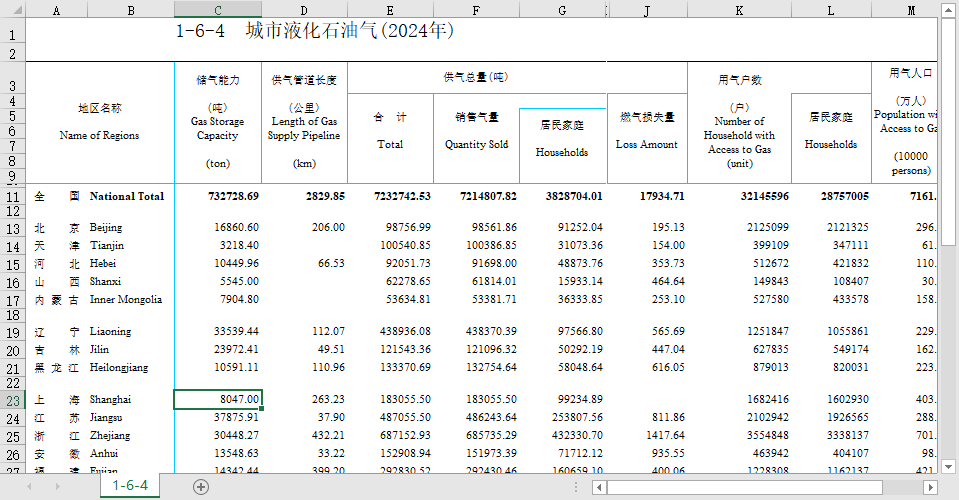 全国32个省份城市液化石油气2006-2024供气销售气量燃气损失量居民家庭用气人口等