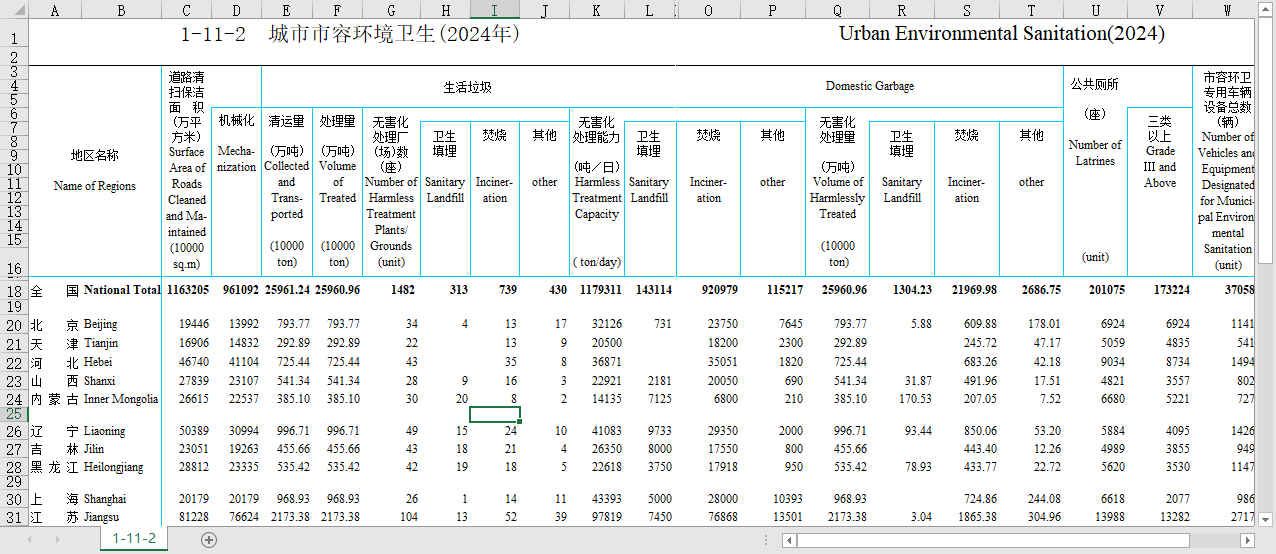 全国32个省份城市市容环境卫生生活垃圾无害化处理量机械化清运量卫生填埋焚烧公共厕所2006-2024