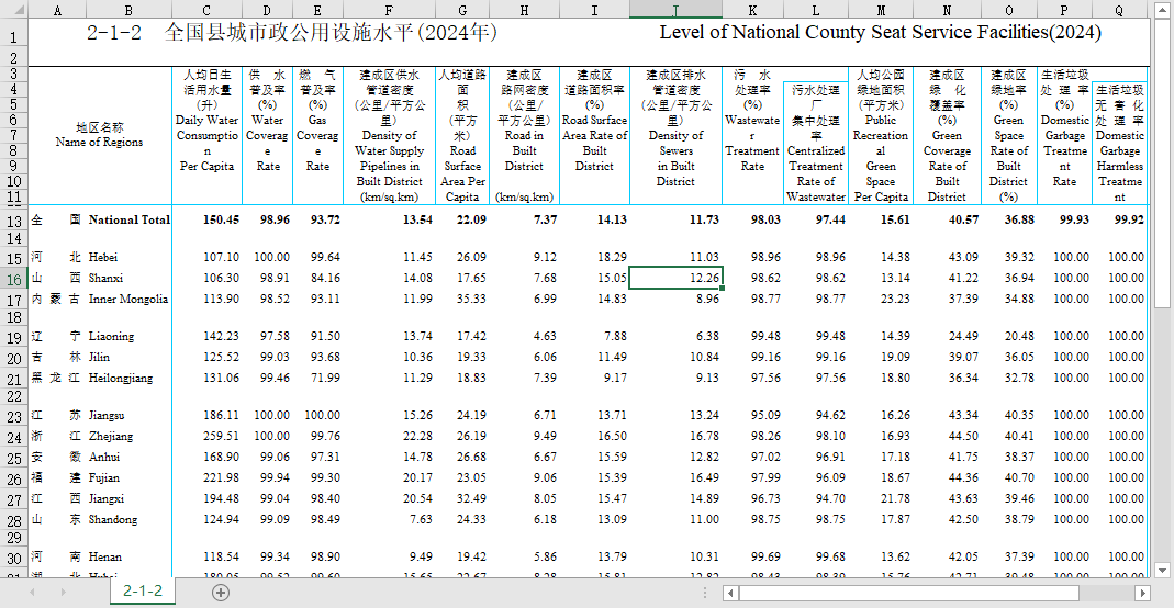 全国32个省份县城市政公用设施水平供水燃气普及率人均道路面积人口路网密度污水处理率2006-2024