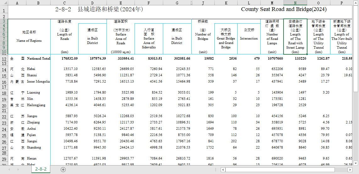 全国32个省份分省县城道路和桥梁2006-2024建成区人行道面积长度路灯盏数地下综合管廊等
