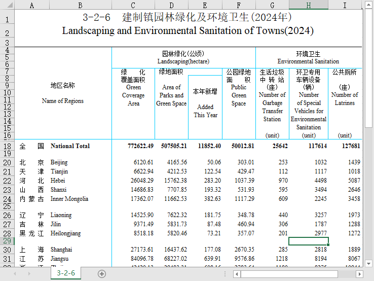 全国32个省份建制镇乡级特殊区域园林绿化及环境卫生2007-2024绿化覆盖公园绿地面积环卫专用车辆社保公共厕所个数等