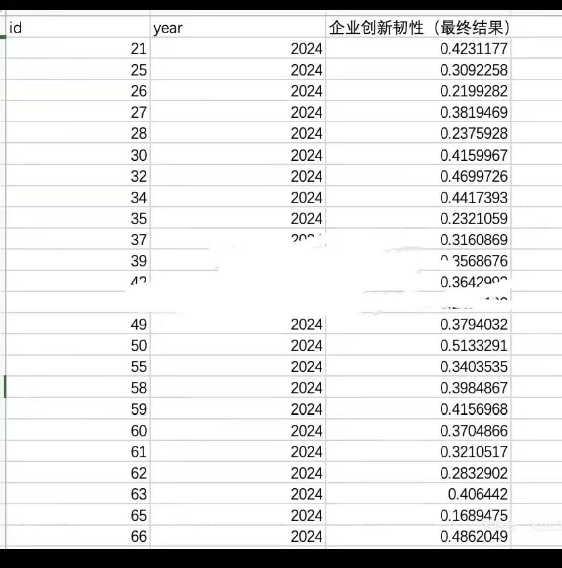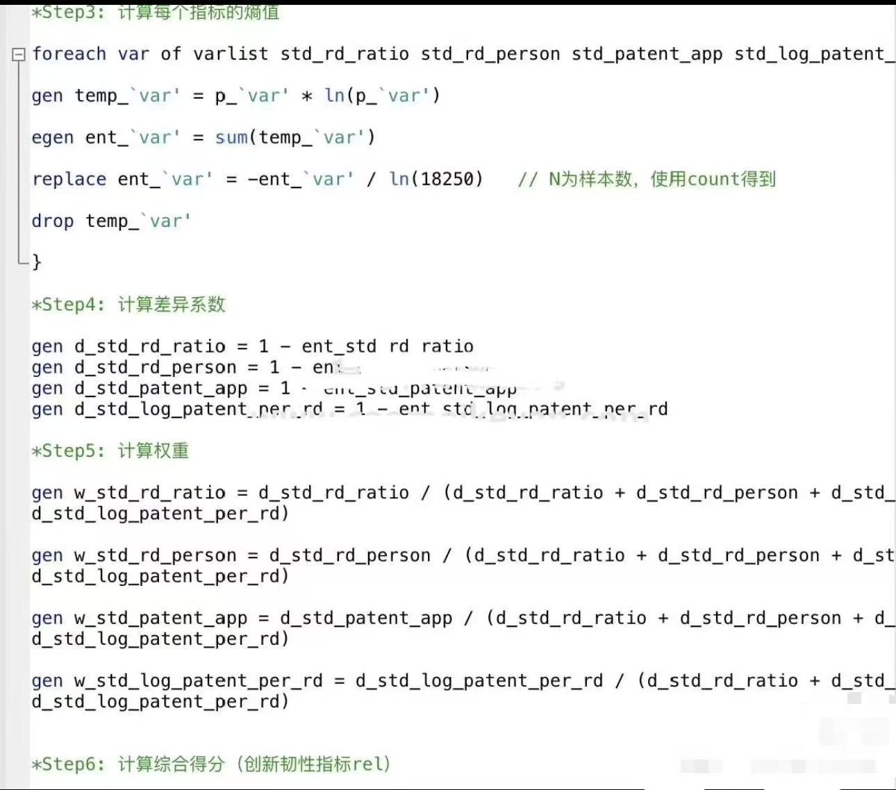 测算方式:参考顶刊《科学学研究》梁婧姝(2024)的做法,现 有 研 究 通 常 用 研发投入占比作为企 业 创 新 的 代 理 变 量,然 而 研 发 投入是否能转化为创新产出难以评估。 也有人用专利作为创新的代理变 量,但 由 于 专 利 申 请 内 容 以 及 外部法律环境的变化,专 利 数 量 与 创 新 之 间 的 关 系 变得不再稳定,因此 使 用 专 利 数 量 衡 量 创 新 也 缺 乏 可靠性,本文从企业创新的投 入,产 出 和 企 业 创 新效率三个角度,分 别 选 择 了 企 业 研 发 投 入 占 总 资 产的比重、员工中研究人员数量、专利申请数标准化指数和用专利申请数除以研发投入的对数值衡量的企业创新效率标准 化 构 建 指 数。 使 用 SPSS 软 件(我们用的是stata) 进 行熵权法分析得到计 算 了 各 指 标 的 熵 权 重,按 此 权 重生成了创新综合指数进行回归。