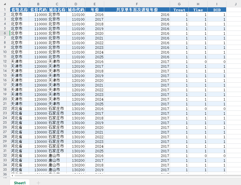 在变量定义方面,“共享单车首次进驻年份”指某地级市首次出现共享单车在城市公共空间中投放并上线运营的年份。Treat 为处理组虚拟变量,若某城市在 2016—2025 年期间曾发生共享单车进驻,则 Treat 取值为 1,否则取值为 0。Time 为时间虚拟变量,对于已发生共享单车进驻的城市,自其首次进驻年份及之后年份取值为 1,在进驻之前年份取值为 0;对于未发生共享单车进驻的城市,Time 始终取值为 0。DID 为 Treat 与 Time 的交互项,用于刻画城市在第 t年是否已处于共享单车进驻状态,从而为构建双重差分(DID)识别框架提供核心解释变量。