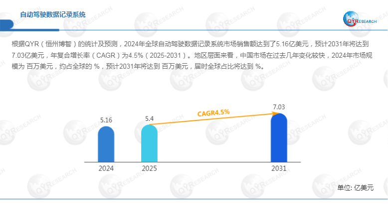根据QYResearch最新调研报告显示,预计2031年全球自动驾驶数据记录系统市场规模将达到731百万美元,未来几年年复合增长率CAGR为4.5%。