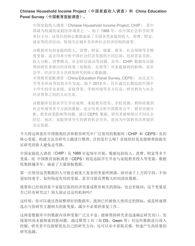 Chinese Household Income Project(中国家庭收入调查)和 China EducationPanel Survey(中国教育面板调查)。中国家庭收入调查(ChineseHouseholdIncomeProject, CHIP) 是中国最为权威的家庭经济调查之一,始于1988年,由中国社会科学院等单位主办。该项目的核心数据涵盖了全国各类家庭的收入、消费、财富、就业等经济活动,特别关注城乡差异和社会经济结构的演变。该数据库包括家庭的收入、消费、财富、储蓄、债务、社会保障等多维度变量,适合用来分析中国社会经济发展的不同层面,包括贫富差距、收入分配、消费模式、社会阶层流动等问题。此外,CHIP 数据库还能帮助研究者探讨经济政策(如税收、社保等)对家庭福利的影响,是社会学、经济学及公共政策研究的核心数据源。中国教育面板调查(ChinaEducationPanelSurvey,CEPS) 由北京大学等多所高等院校合作发起,始于2013年,旨在通过长期追踪中国中小学生的学业表现、家庭背景、学校环境等多方信息,研究教育与社会经济背景之间的互动关系。该数据库包括从学生学业成绩、家庭教育投资、学校资源、教师质量到社会环境等多个方面的数据,适合用来分析中国教育公平、教育资源分配、教育政策影响等问题。通过CEPS 数据,研究者能够探讨不同社会阶层、地区、家庭背景学生的教育机会差异,进而为中国教育改革提供实证依据。今天将这两套在中国微观经济和教育研究中广泛使用的数据库(CHIP 和 CEPS)里的核心变量、构建方法及研究主题进行整理,目的是什么呢?直接的好处是能够帮助做实证研究的新人避免走弯路。中国家庭收入调查(CHIP)从1988年起每年开展,数据包括收入、消费、财富等多个变量,而 中国教育面板调查(CEPS)则是追踪学生学业与家庭教育投入等变量,数据收集跨越多年,涵盖了大量面板数据。第一次使用这类数据的人可能会被庞大复杂的变量所困惑,面对成千上万的字段,不知道如何着手、如何构造有用的变量,甚至可能花费数天时间清洗数据。就算你已经找到某个家庭层面的经济变量或教育相关的指标,也会有疑问:这个变量是否已经有研究过?别人验证过这些机制吗?这时候,你可以通过查阅整理好的数据库,找到已经被他人使用过的指标,或是快速筛选出与你研究主题相关的新变量,减少不必要的重复工作。这两套数据库中的数据内容和变量广泛且丰富,能够帮助研究者迅速确定研究切口,发现那些尚未被探索的新问题。通过模型工具(如DS、Qwen等)对这些数据进行深入挖掘,研究者不仅能够优化自己的研究方向,还可以从中获取灵感,快速产生高质量的研究选题。无论你是初入实证研究的新人,还是经验丰富的学者,整理好的CHIP和CEPS数据库将使你能够更加高效地定位研究问题,找到切实可行的研究路径,从而在复杂庞大的数据中获得研究的突破。
