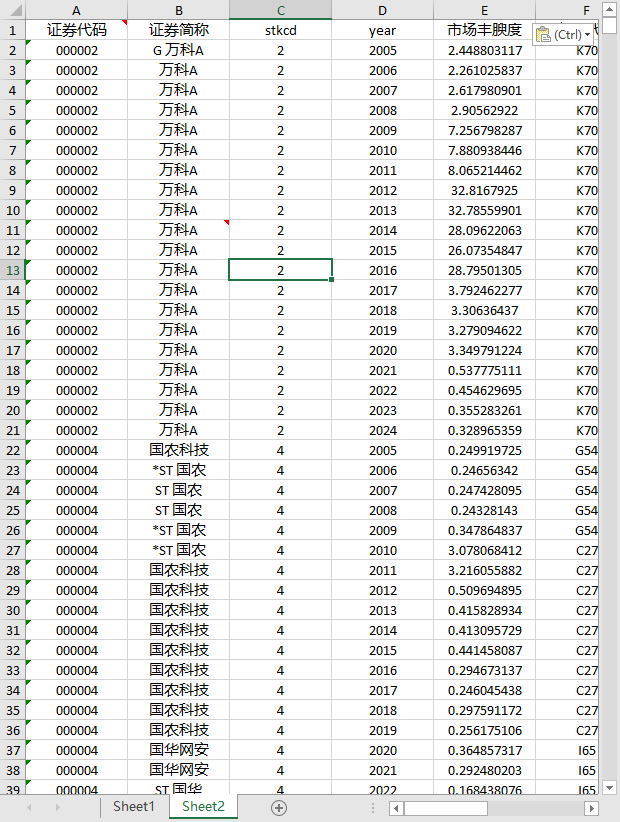 证券代码 证券简称 stkcd year 市场丰腴度 行业代码 行业名称 所属省份 所属省份代码 所属城市 所属城市代码