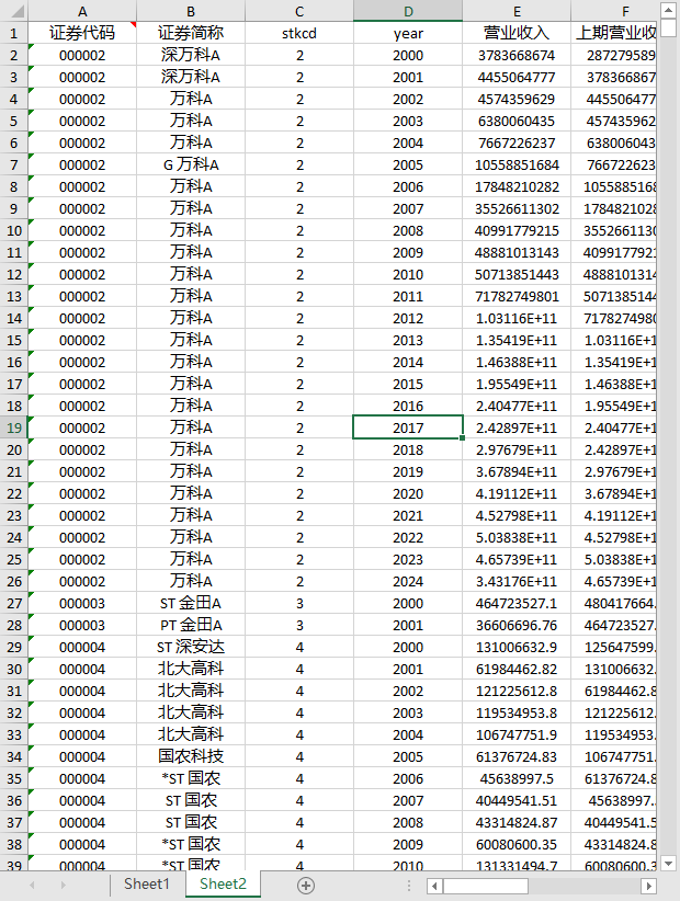 证券代码 证券简称 stkcd year 营业收入 上期营业收入 行业代码 行业名称 所属省份 所属省份代码 所属城市 所属城市代码
