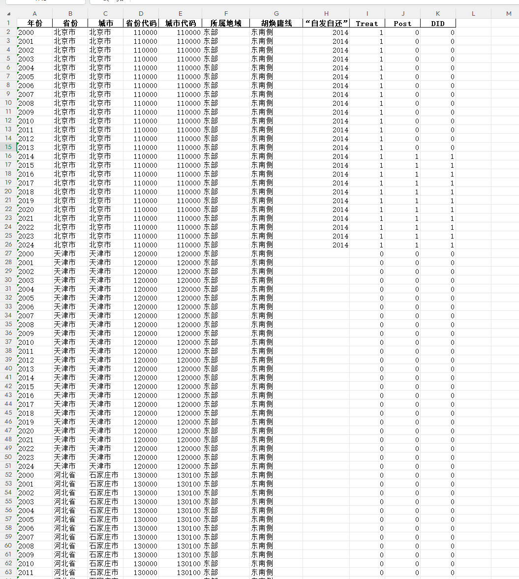 - 赋值逻辑:若地级市所属省份(或本身为计划单列市)属于2014年首批“自发自还”试点名单(上海、浙江、广东、深圳、江苏、山东、北京、江西、宁夏、青岛),则 Treat = 1;否则 Treat = 0。