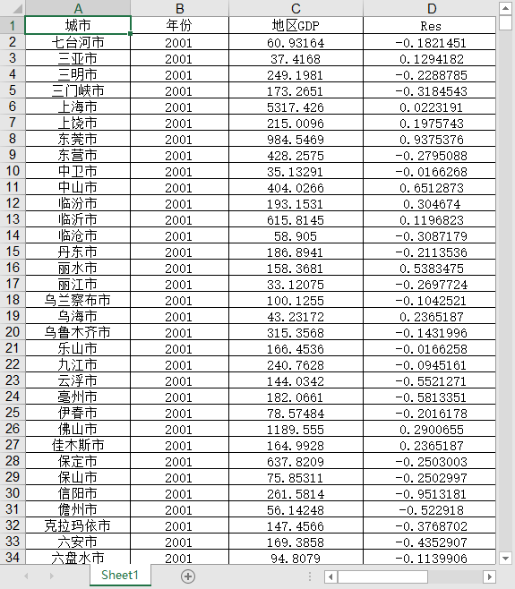 数据指标:城市名称、年份、地区GDP、Res、中心化RES