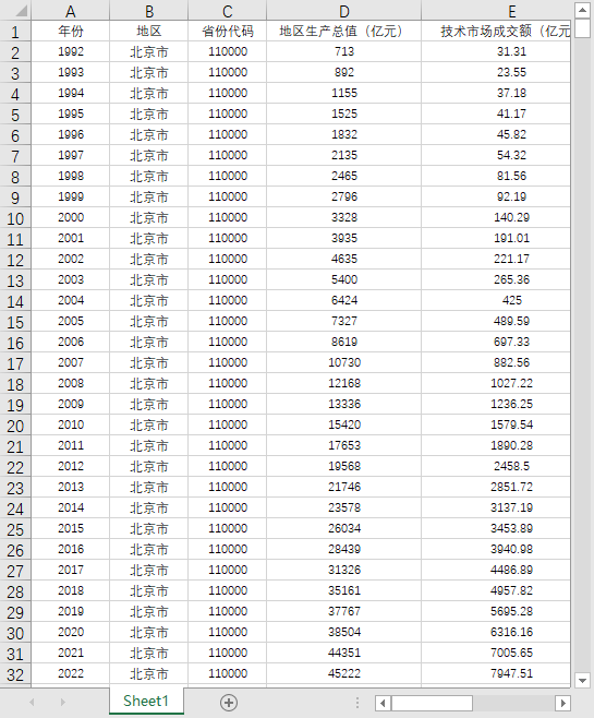 年份 地区 省份代码 地区生产总值(亿元) 技术市场成交额(亿元) 知识产权保护强度