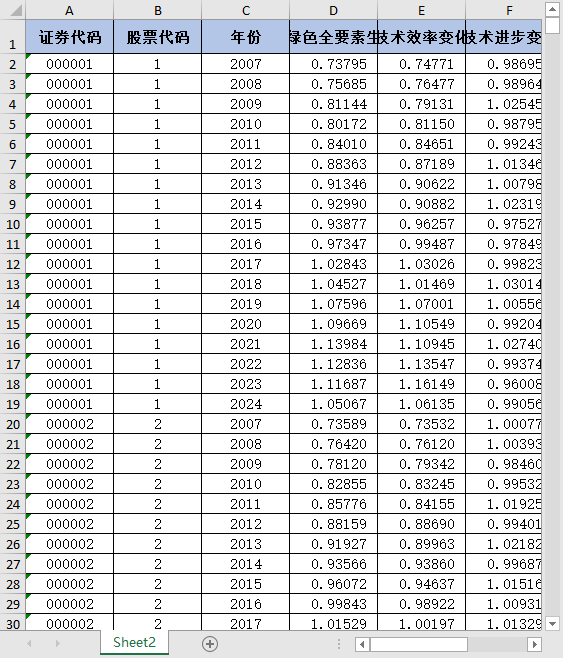 证券代码 股票代码 年份 企业绿色全要素生产率 绿色技术效率变化指数 绿色技术进步变化指数