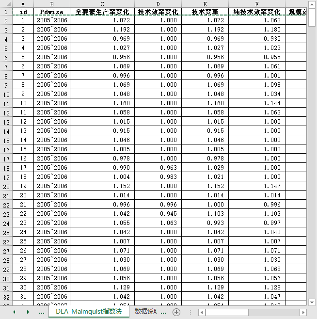 id Pdwise 全要素生产率变化 技术效率变化 技术变革 纯技术效率变化 规模效率变化 省份 id year 全要素生产率