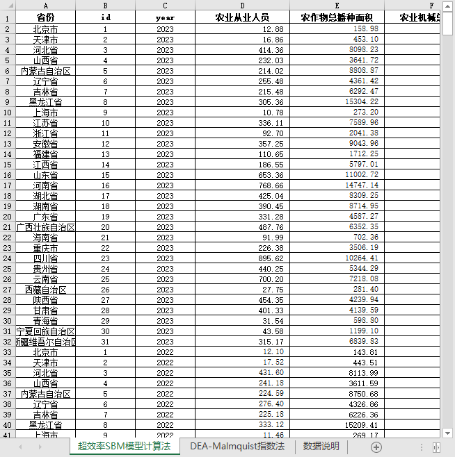省份 id year 农业从业人员 农作物总播种面积 农业机械总动力 农用化肥投入 农药使用量 农用塑料薄膜使用量 农业有效灌溉面积 2005年为基准的农业总产值 农业全要素生产率1 2011年为基准的农业总产值 农业全要素生产率2 2012年为基准的农业总产值 农业全要素生产率3