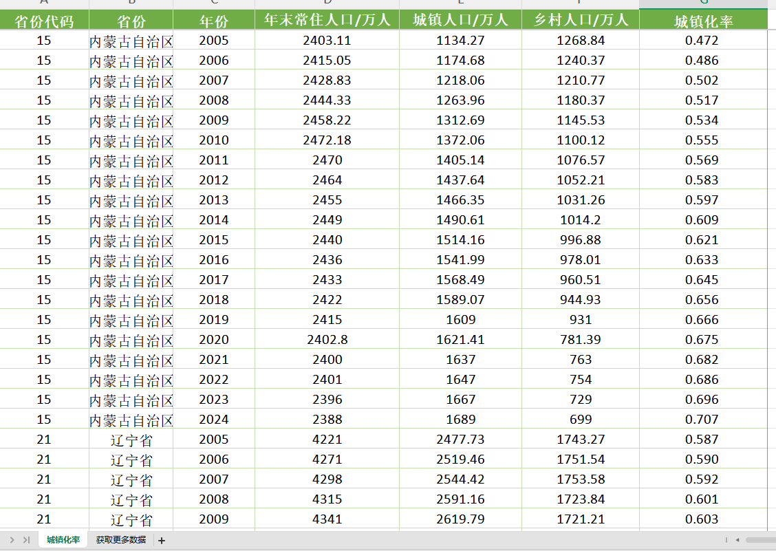 【更新2024年】31个省份城镇化率数据/年末常住人口/城镇人口,2005-2024年,提供原始数据+计算过程,excel版,整理好的面板数据
