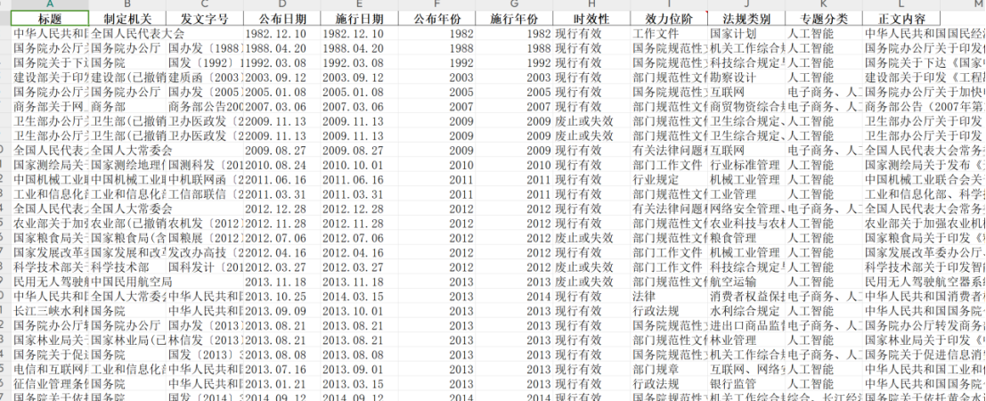 参考《统计研究》董直庆(2025)、《数量经济技术经济研究》胡化广(2025)的做法,根据人工智能的关键词。爬取了北大法宝公开的人工智能政策数据,包括法律规定、行政法规、司法解释、部门规章、党内法规制度、行业规定等