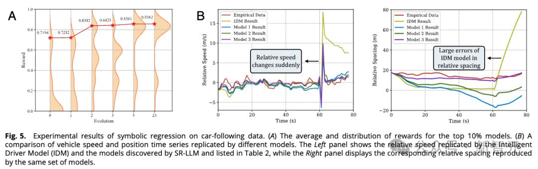 更关键的是,在人类跟车行为建模这一尚无共识的开放问题中,它不仅成功复现了经典跟驰模型的核心结构,还从真实车辆轨迹中发现了拟合性能更优、物理意义更清晰的新模型。