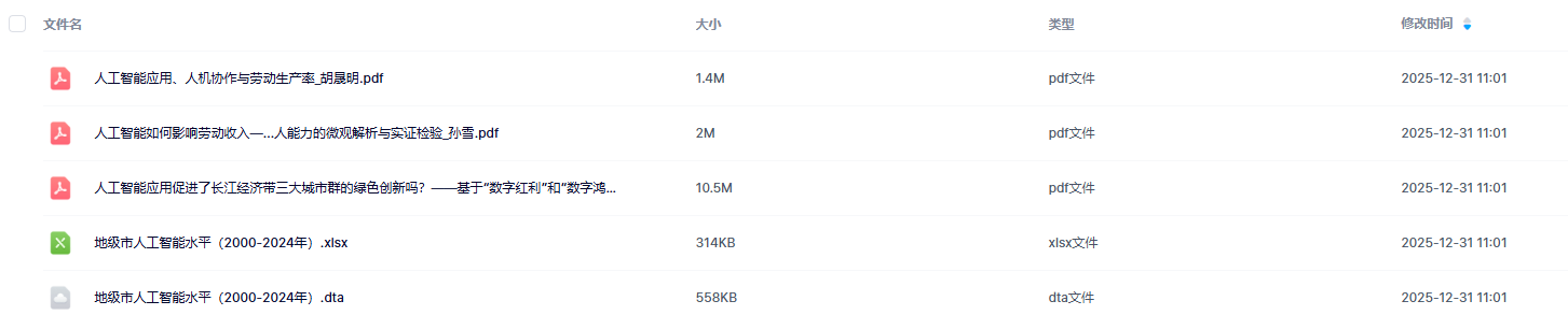 一、数据介绍数据名称:地级市-人工智能水平测算数据