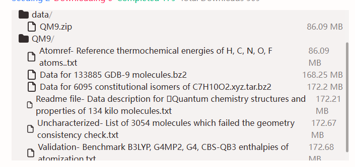 获取方式:提供压缩包下载(含 QM9.zip 主文件及各类配套数据压缩包),支持科研场景直接调用,适配主流量子化学分析软件。