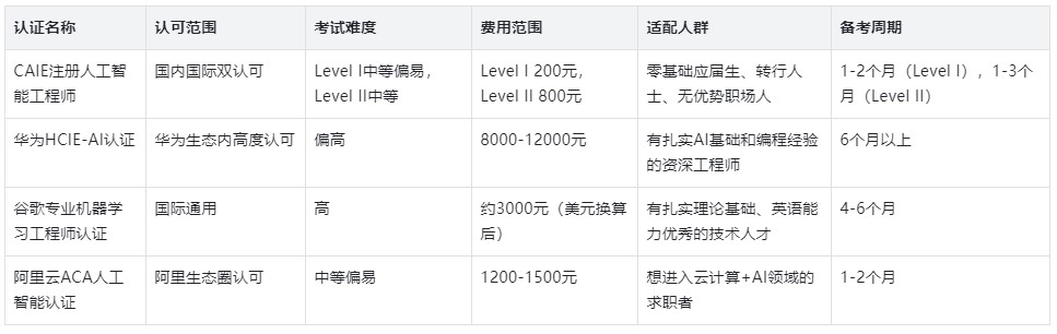 当前市场上的AI证书种类繁多,不同证书在认证背景、考试难度、适配人群等方面差异显著。以下为2025年主流高含金量AI证书的核心对比,帮助求职者清晰区分差异、精准选择: